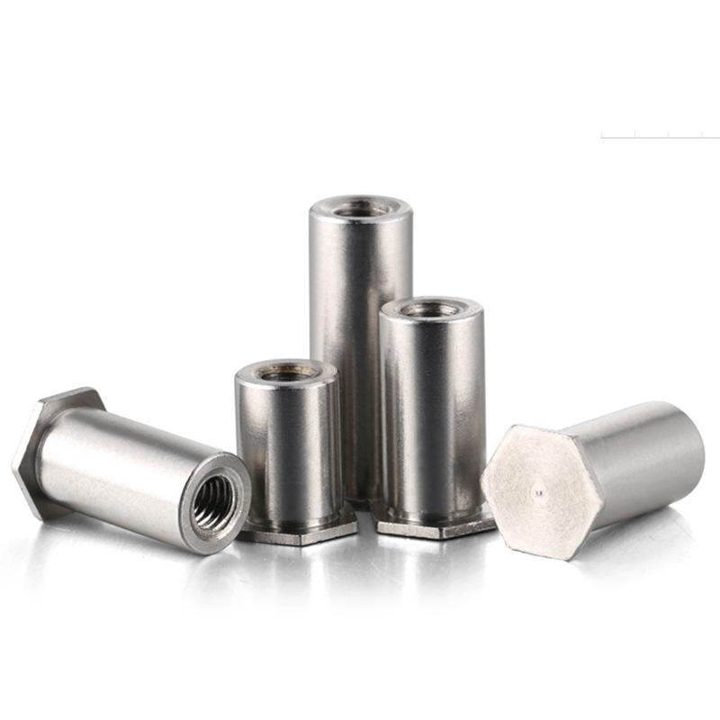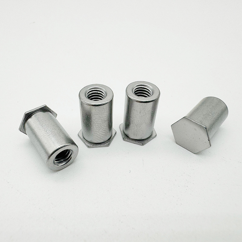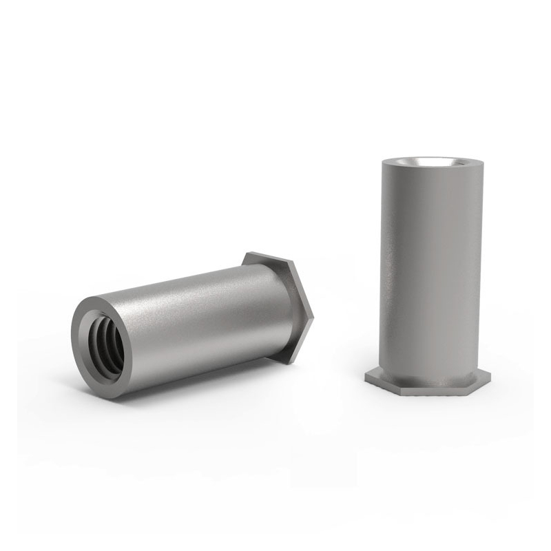 Sokea reikä tasainen pään kuusikulmio niitattu mutteri on kiinnitys, joka sopii ohuille materiaaleille. Se on vahva ja kestävä, ja lankaa ei ole helppoa käyttää. Siinä on heksa-muoto helppoa asennusta varten, litteä upotuspää, joka istuu huuhtelussa, ja mutterin runko suljettujen sokeiden reikien kanssa. Kun asennat sen, mutteri muodonmuutos mekaanisesti (kuten niittaaminen) lukitsemaan materiaalille.
