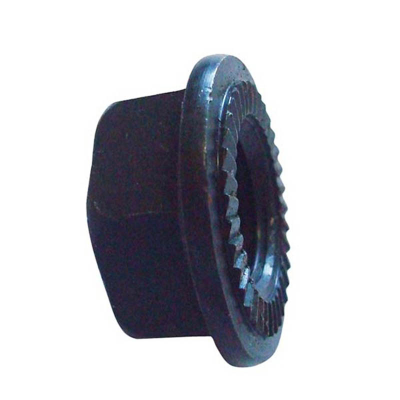 | Keskikokoinen hiiliteräs | Näitä sahalaipaisia kuusikulmaisia lukitusmuttereita voidaan käyttää autojen jousitusosissa tai perävaunun vetokoukuissa. Niihin käytetty teräs on lämpökäsitelty, joten sahalaitainen rakenne voi kiinnittyä lujasti rikkoutumatta. Ne kestävät tärinää maantieajon aikana tai raskaita kuormia löystymättä. Yleensä ne on päällystetty paksummalla sinkkikerroksella. |
