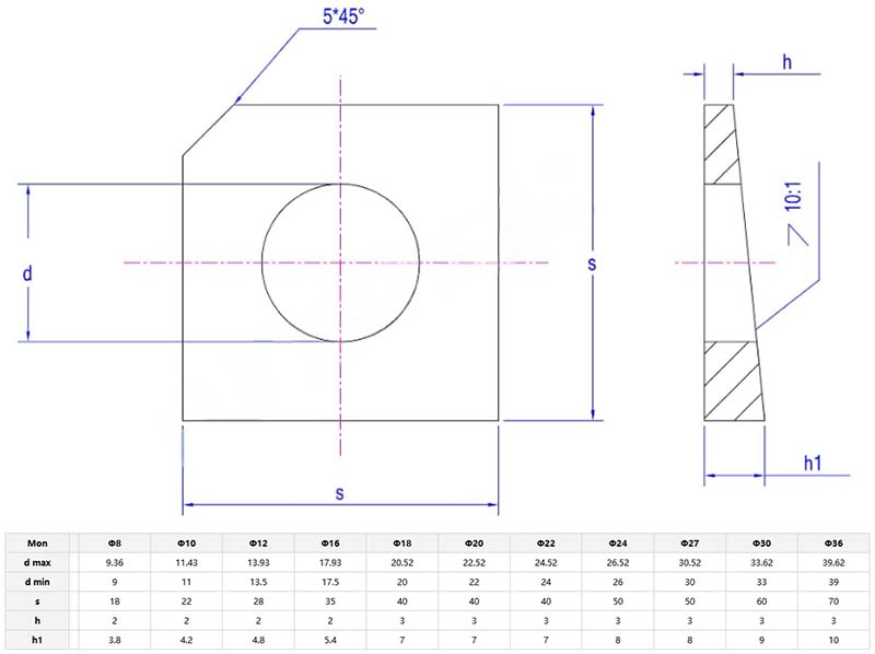 Neliön kalteva aluslevy on vakiokoko, ja se voidaan tehdä räätälöityinä erilaisiin projektitarpeisiin. Vakiokokojen halkaisija on 1/4 " - 2", paksuus on 1,5–6 mm. Ulompi neliöosa vastaa yleensä pultin pään kokoa, joten ne toimivat yhdessä. Voit hankkia mukautettuja versioita erityisillä viistokulmilla tai isommilla kooilla raskaiden töiden kanssa. Ne tarjoavat yksityiskohtaiset piirustukset ja koon tiedot varmistaakseen, että aluslevyt sopivat hyvin olemassa oleviin kiinnitysjärjestelmiin.